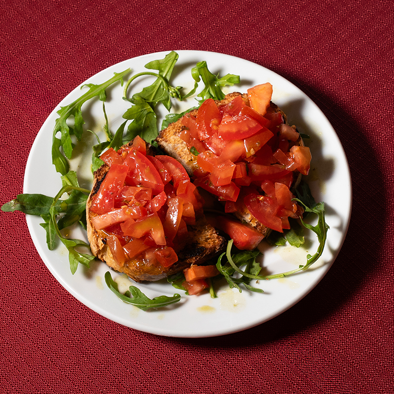 Bruschetta con pomodorini, aglio, olio EVO e salsa di basilico