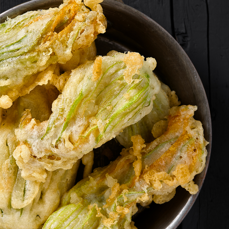 Fiori di zucca fritti ripieni di alici e mozzarella di bufala