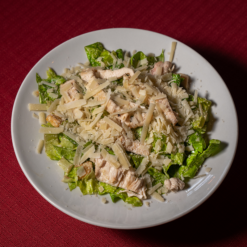 Salad with romain lettuce, diced chicken, croutons, shaved pecorino cheese and cesar dressing
