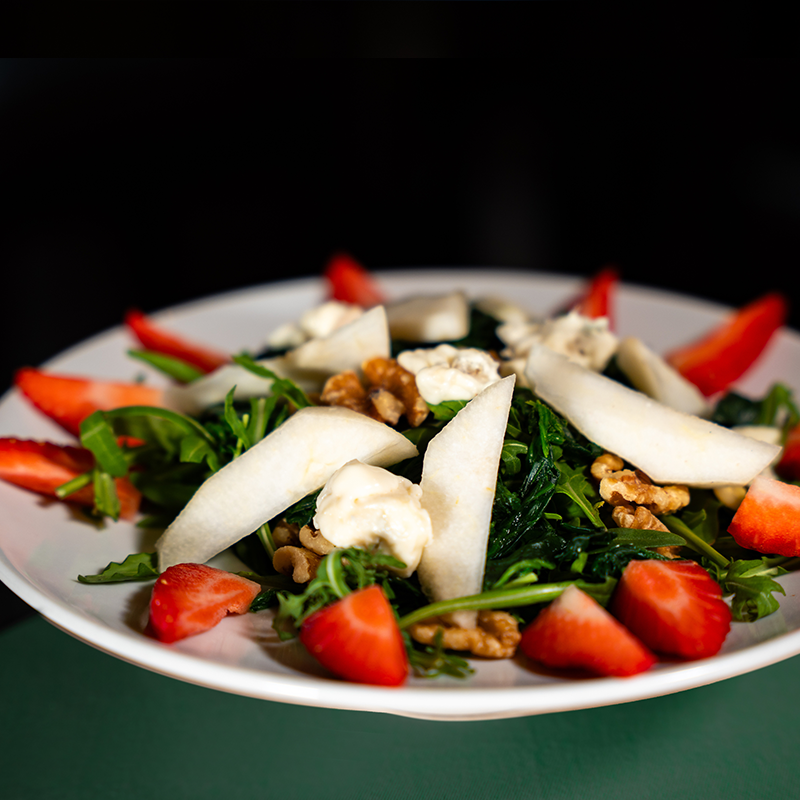 Insalata Gustosa Rucola, sedano, gorgonzola, spinaci, pere, noci e fragole fresche