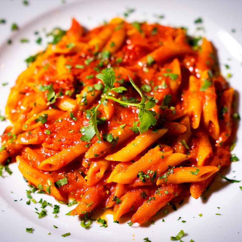 Penne with crushed spicy red pepper, parsley and tomato sauce.