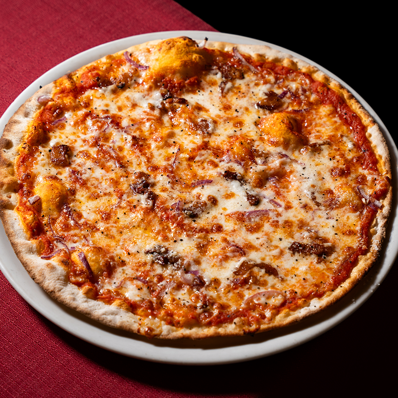 Pizza with tomato sauce, mozzarella, bacon, onion and pecorino cheese.