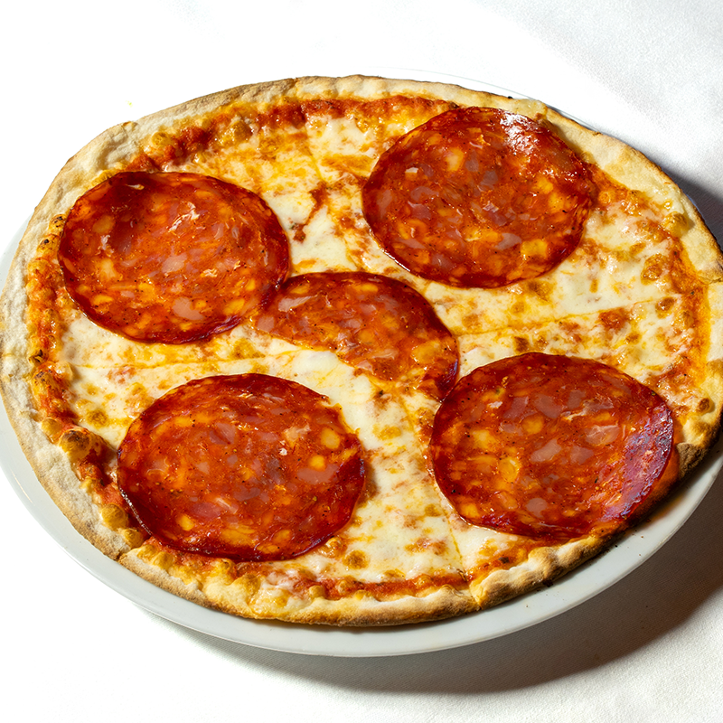 Pizza with tomato sauce, mozzarella and spicy salami