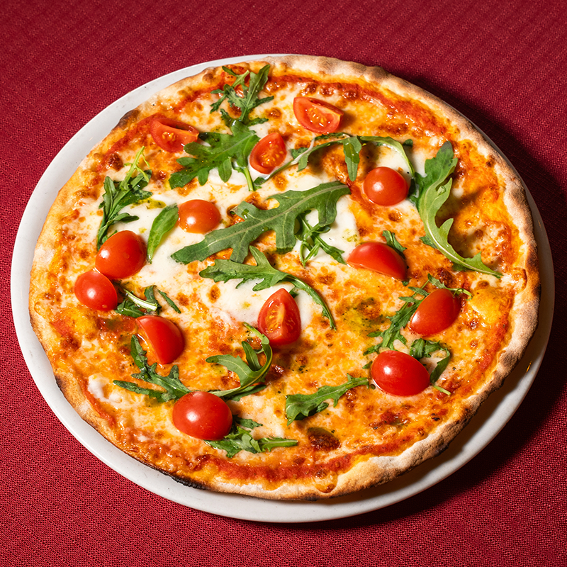 Pizza with mozzarella, rocket, cherry tomato and fresh handcut buffalo mozzarella