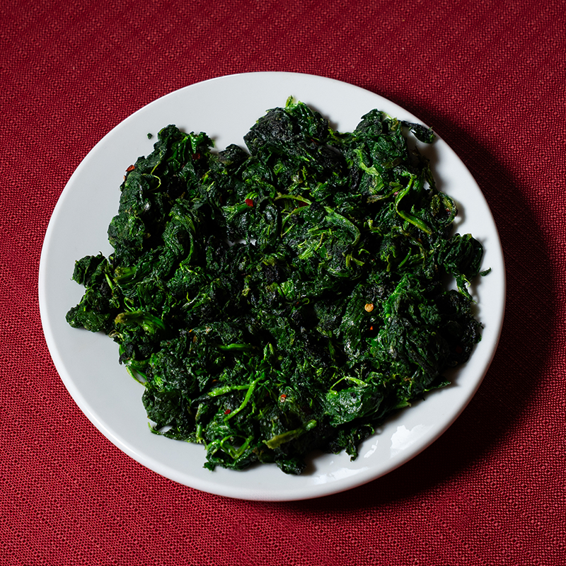 Spinach with extra virgin olive oil, garlic and red pepper.