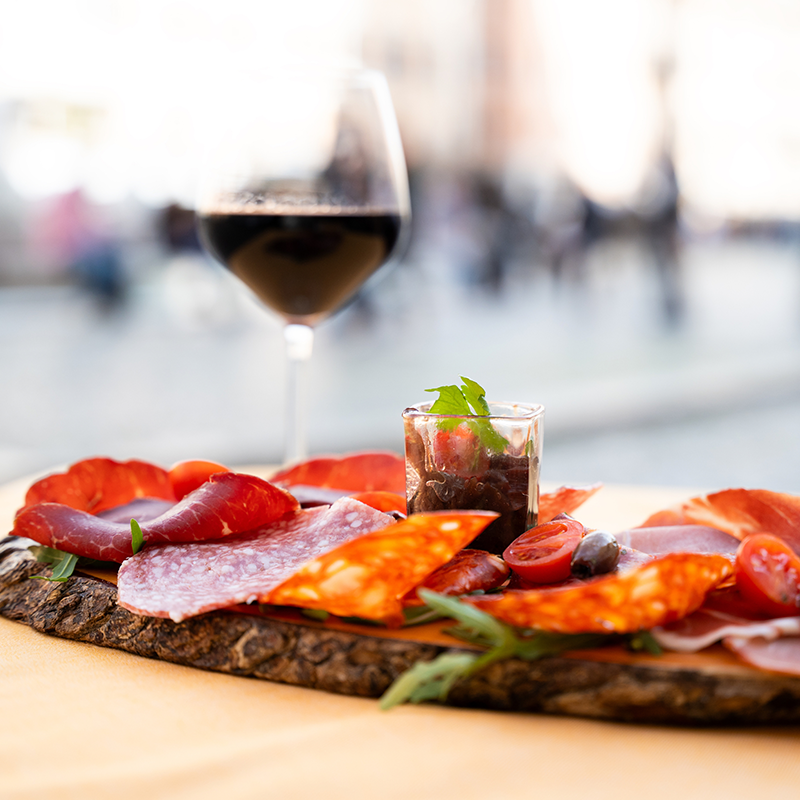 Selection of typical italian cold cuts, served with arugula, onion and jam mostard.